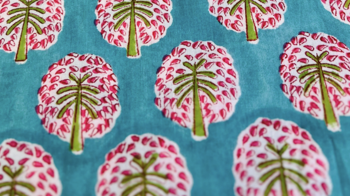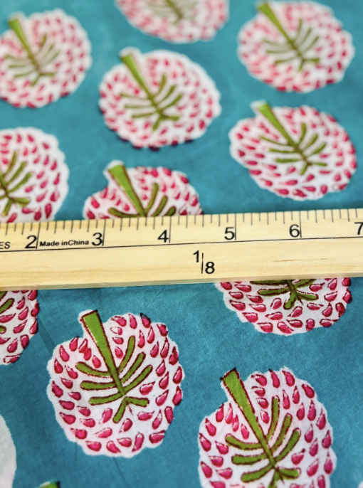 This lightweight cotton woven features a whimsical floral design in rich teal, hand block printed with care. A soft, breathable fabric with a decorative border, it’s perfect for dresses, blouses, robes, and home projects that call for a touch of color and artistry.