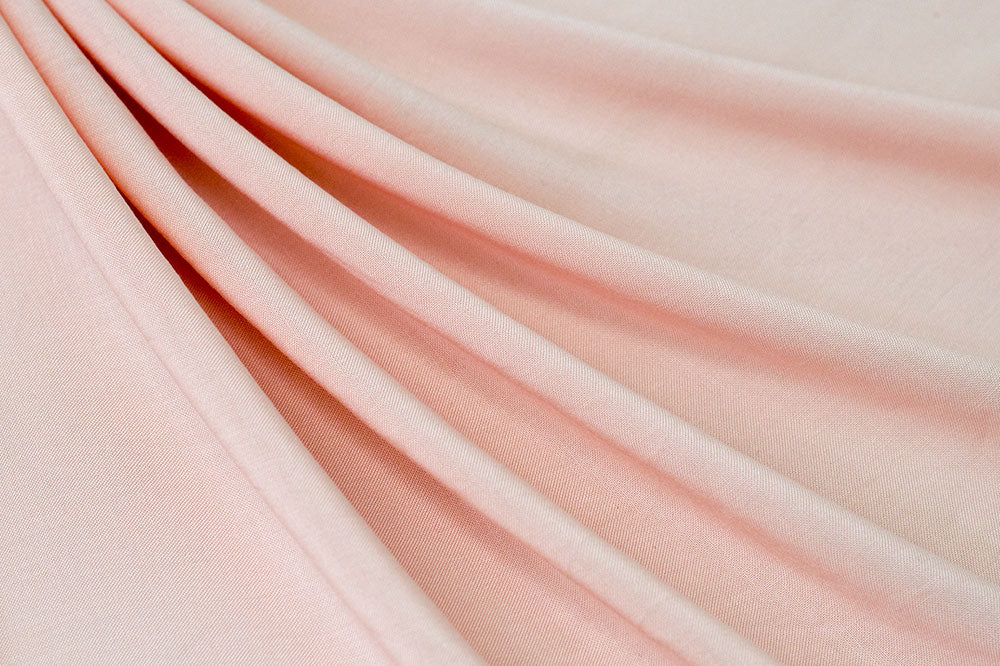 Soft blush pink rayon challis fabric has a beautiful fluid drape and soft hand. It is perfect for creating shirts, blouses, gathered skirts and flowing dresses with a lining. Woven no stretch fabric.